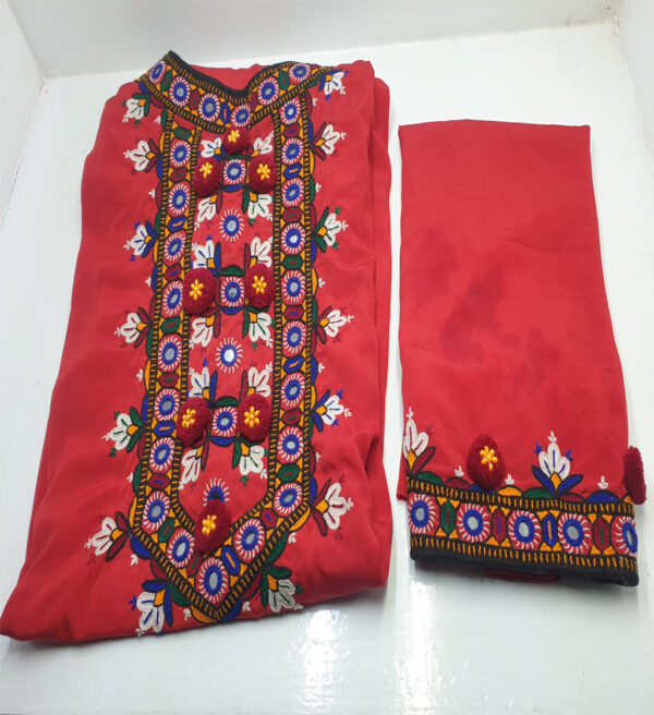Sindhi culture is one of the many varieties of customs and traditions that represent Pakistan. In our Sindhi Collection, we’ve brought you various items to choose from and celebrate the culture through. This Handmade Sindhi 2 Piece suit, comes with a Shirt & Trouser. It’s made with a Red base and has multi-colored Embroidery.